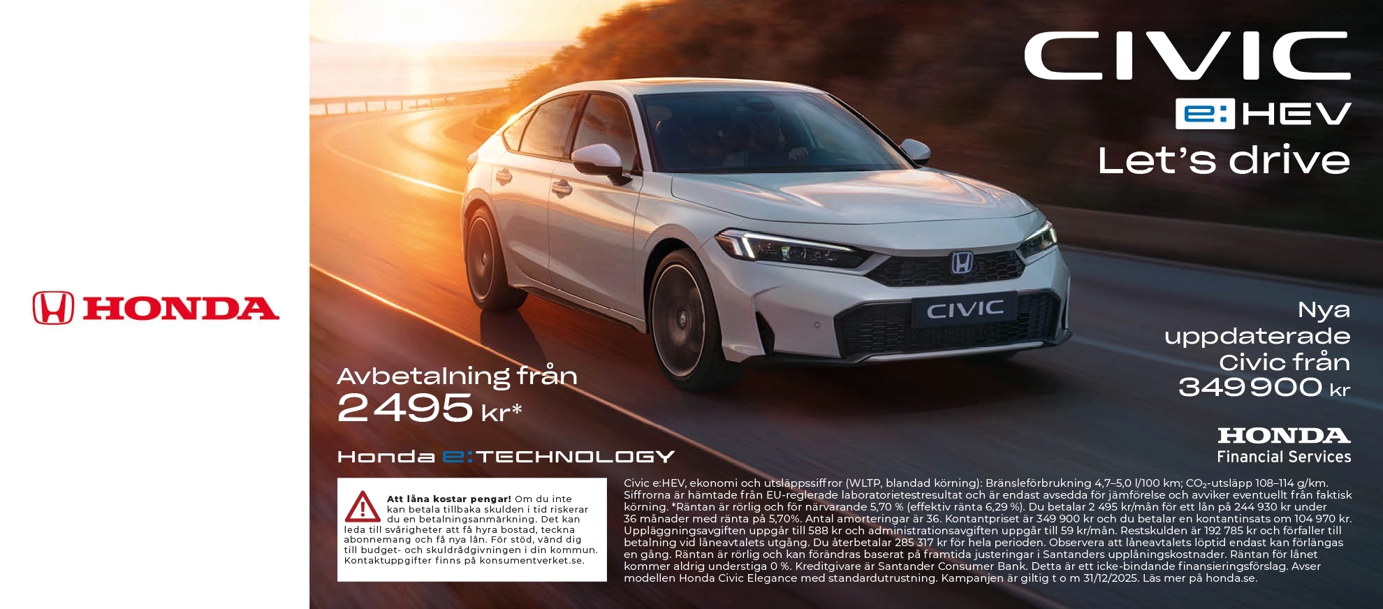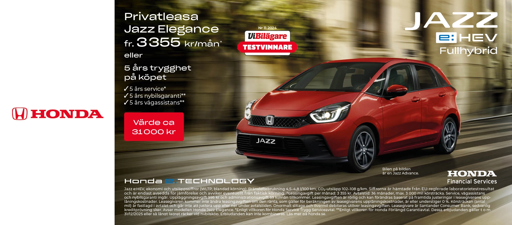 • Trygghetskampanj – Vid köp av testvinnaren Honda Jazz Hybrid så ingår det just nu 5 års Trygghetspaket. Trygghetspaketet innehåller – 5 år/10 000 mil fri service, 5 års fabriksgaranti samt 5 års vägassistans