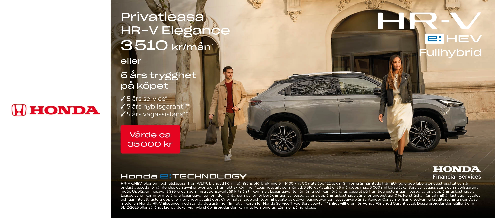 • Trygghetskampanj – Vid köp av Honda HR-V Hybrid så ingår det just nu 5 års Trygghetspaket. Trygghetspaketet innehåller – 5 år/10 000 mil fri service, 5 års fabriksgaranti samt 5 års vägassistans