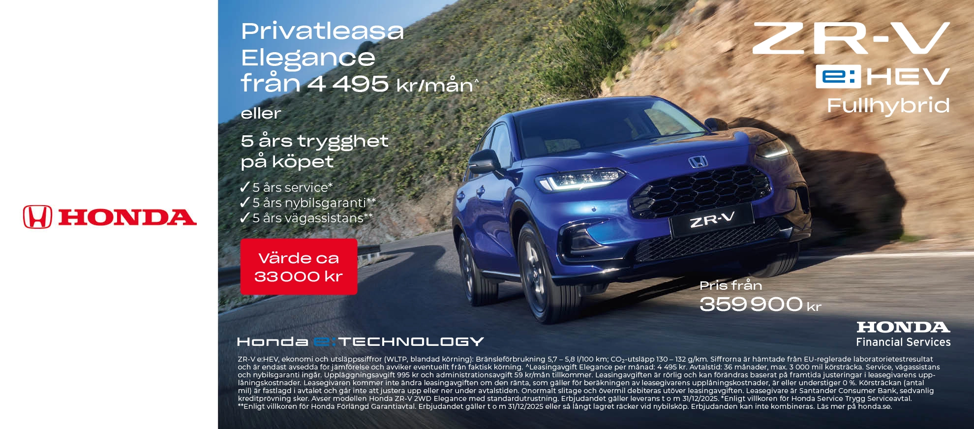 • Trygghetskampanj – Vid köp av Honda ZR-V Hybrid så ingår det just nu 5 års Trygghetspaket. Trygghetspaketet innehåller – 5 år/10 000 mil fri service, 5 års fabriksgaranti samt 5 års vägassistans