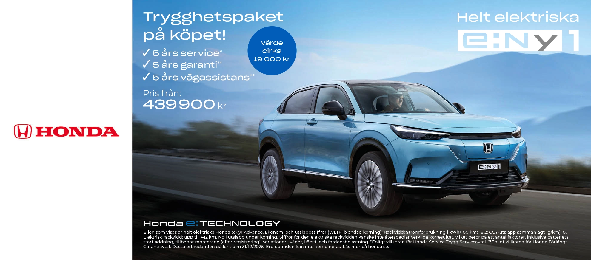 • Trygghetskampanj – Vid köp av Honda e:Ny1 så ingår det just nu 5 års Trygghetspaket. Trygghetspaketet innehåller – 5 år/10 000 mil fri service, 5 års fabriksgaranti samt 5 års vägassistans